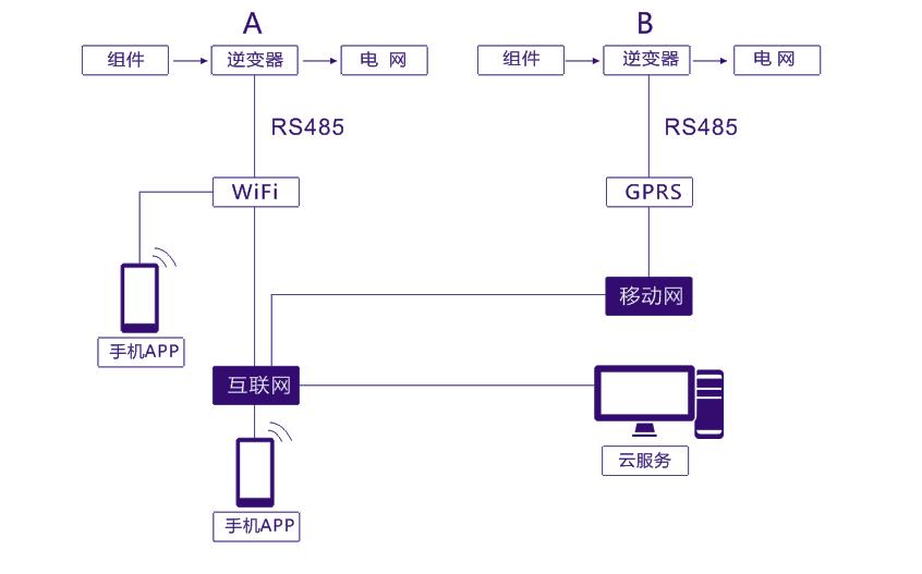 戶用型智能逆變器中配套WIFI無(wú)線通信模塊,與家用無(wú)線路由即可通過(guò)手機(jī)或PC實(shí)時(shí)對(duì)逆變器的運(yùn)行情況進(jìn)行監(jiān)控。也可通過(guò)通信運(yùn)營(yíng)商提供的無(wú)線上網(wǎng)模塊(GPRS/CDMA等)實(shí)現(xiàn)遠(yuǎn)程手機(jī)APP監(jiān)控。